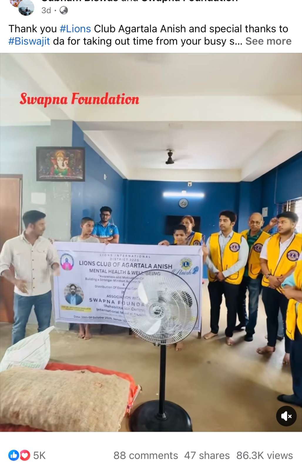 Lions Club of Agartala Anish organized a mental health awareness camp for 95 substance users at Swapna Foundation. During the session, Lion Dr. Arunabha Dasgupta and Lion Ranjan Bose inspired and guided the participants on building mental strength and resilience to help them overcome addiction and stay away from drugs. A video was also circulated which had an online view of 86k. https://www.facebook.com/share/v/1CSR6Bie9Q/?mibextid=wwXIfr