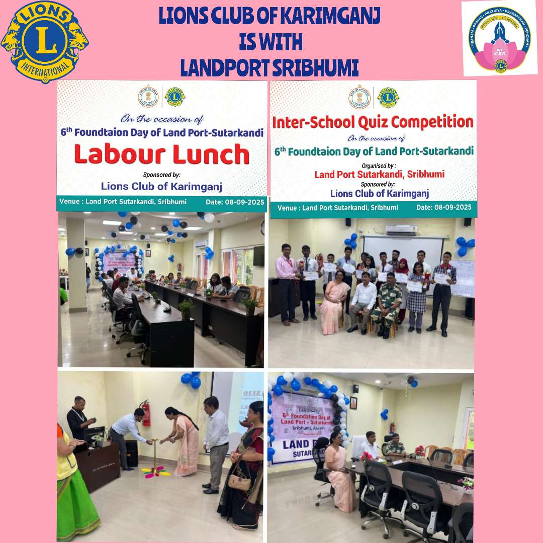 *Lions Club of Karimganj* sponsored two meaningful projects organised by the Land Port Authority of India – at the Land Port premises, Sutarkandi, Sribhumi, on the auspicious occasion of the 6th Foundation Day of Land Port Sutarkandi, in the presence of dignitaries, officials, and members of Lions Club of Karimganj. *1* . *Inter-School Quiz Competition* *2* . *Labour Lunch** *Inter-School Quiz Competition* The quiz competition witnessed enthusiastic participation from 4 school teams, aiming to promote knowledge, awareness, and healthy competition among students. With the formal inauguration by lighting of the ceremonial lamp by Lion President Jaishree Gang, along with LPI Manager Gautam Naug and the BSF Commander in presence of Treasurer Lion Rupali Deb, IPP Lion Sanchayita Deb, Programme Coordinator Lion Binod Kumar Gang, Service Chairman Lion Gautam Deb Roy and other LPI officials and dignitaries, started the highly engaging contest and concluded with prizes and certificates distribution among the winners and participants by the Lion President Jaishree Gang. *Labour Lunch* As part of the foundation day celebration, Lions Club of Karimganj extended its service through the sponsorship of a Labour Lunch. 50 Labourers and staff of the Land Port were provided with a hearty meal, strengthening goodwill and community bonding. This initiative highlighted the club’s commitment to service and compassion, ensuring that the workers at the Land Port were honoured and cared for on this special day. The projects reflected the Lions’ motto of “We Serve”, blending educational encouragement with humanitarian service.