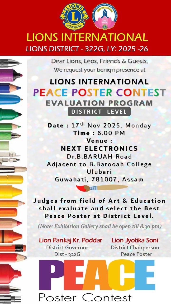 📣 ANNOUNCEMENT *District Level* *PEACE POSTER EVALUATION* *Respected Lion Leaders,* Greetings of the day !! Congratulations on successfully completing the Peace Poster Contest to All Clubs who have with Great efforts put into bring the Imagination of Children to Beautiful Paintings. We are organising DISTRICT LEVEL *PEACE POSTER EVALUATION* of all the Clubs under District 322G. We request Your Presence and come and see all the Beautiful Peace Posters Received. Date - *17th Nov 2025 (Today)* Timing - *6:00 PM - 7:30 PM* Venue - *NEXT ELECTRONICS* Address - *Dr.B Barooah Road,* *Ulubari, Guwahati.* *(Near B Barua College)* Contact No. 9401168107 / 9678700200 *Lion Jyotika Soni* District Chairman - Peace Poster Lions District 322G