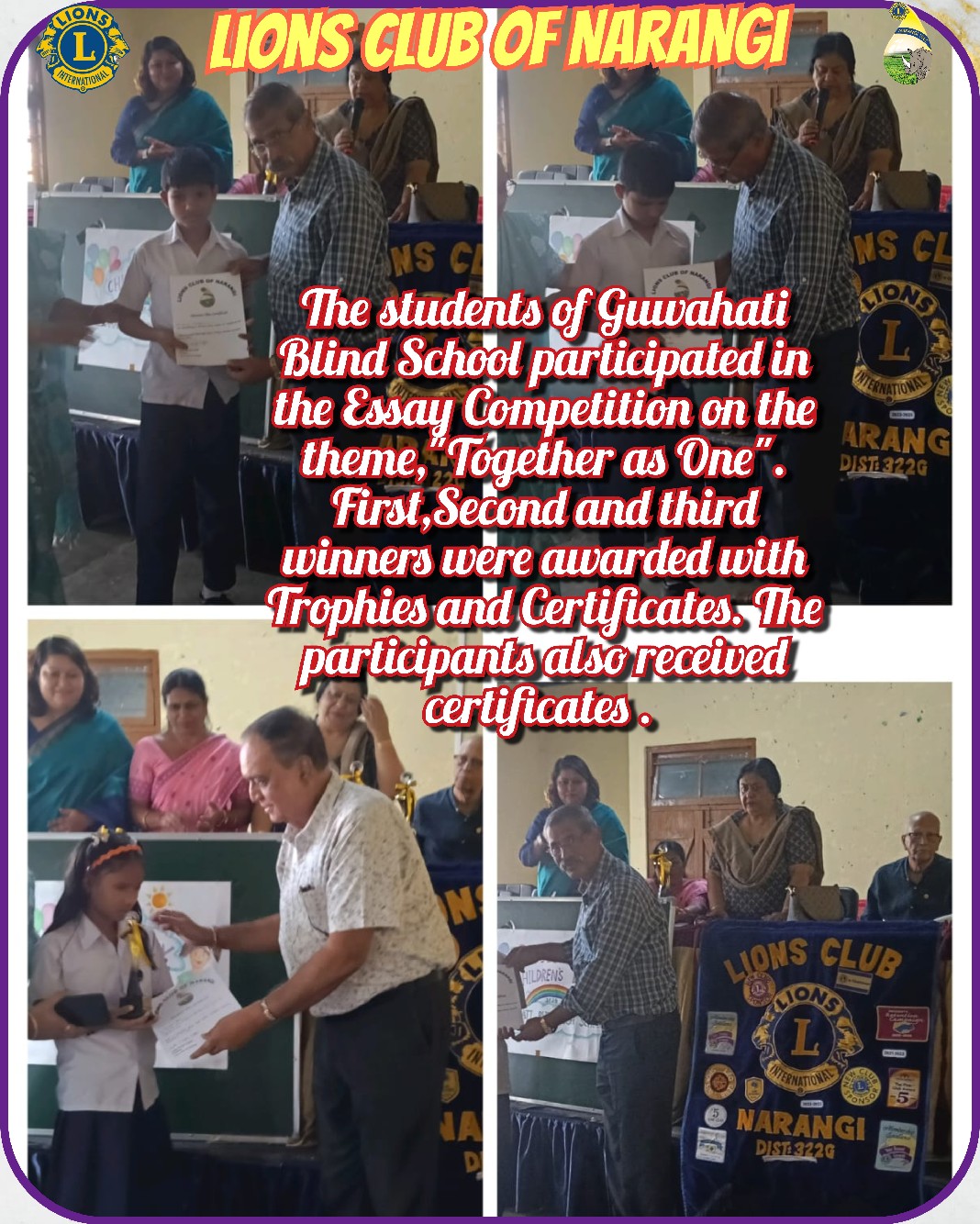 The students of Guwahati Blind School participated in the Essay Competition on the theme,"Together as One". First,Second and third winners were awarded with Trophies and Certificates. The participants also received certificates .