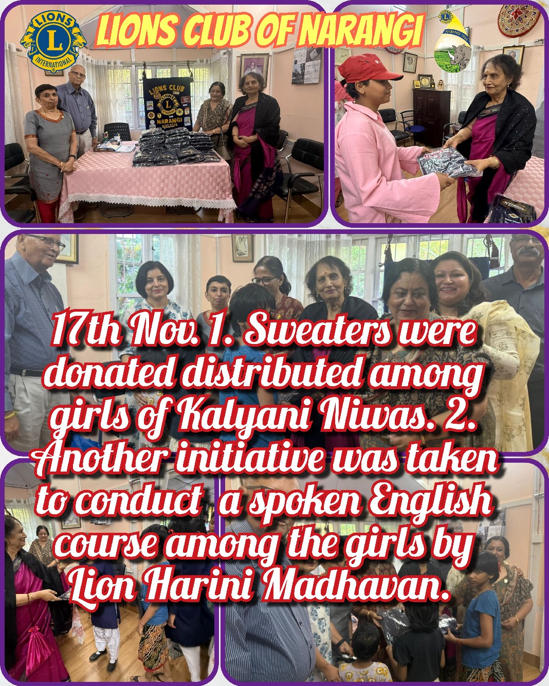 17th November: 1.) Sweaters were distributed among girls of Kalyani Niwas2) Another initiative was taken to conduct a spoken English course among the girls by lion Harini Madhavan.