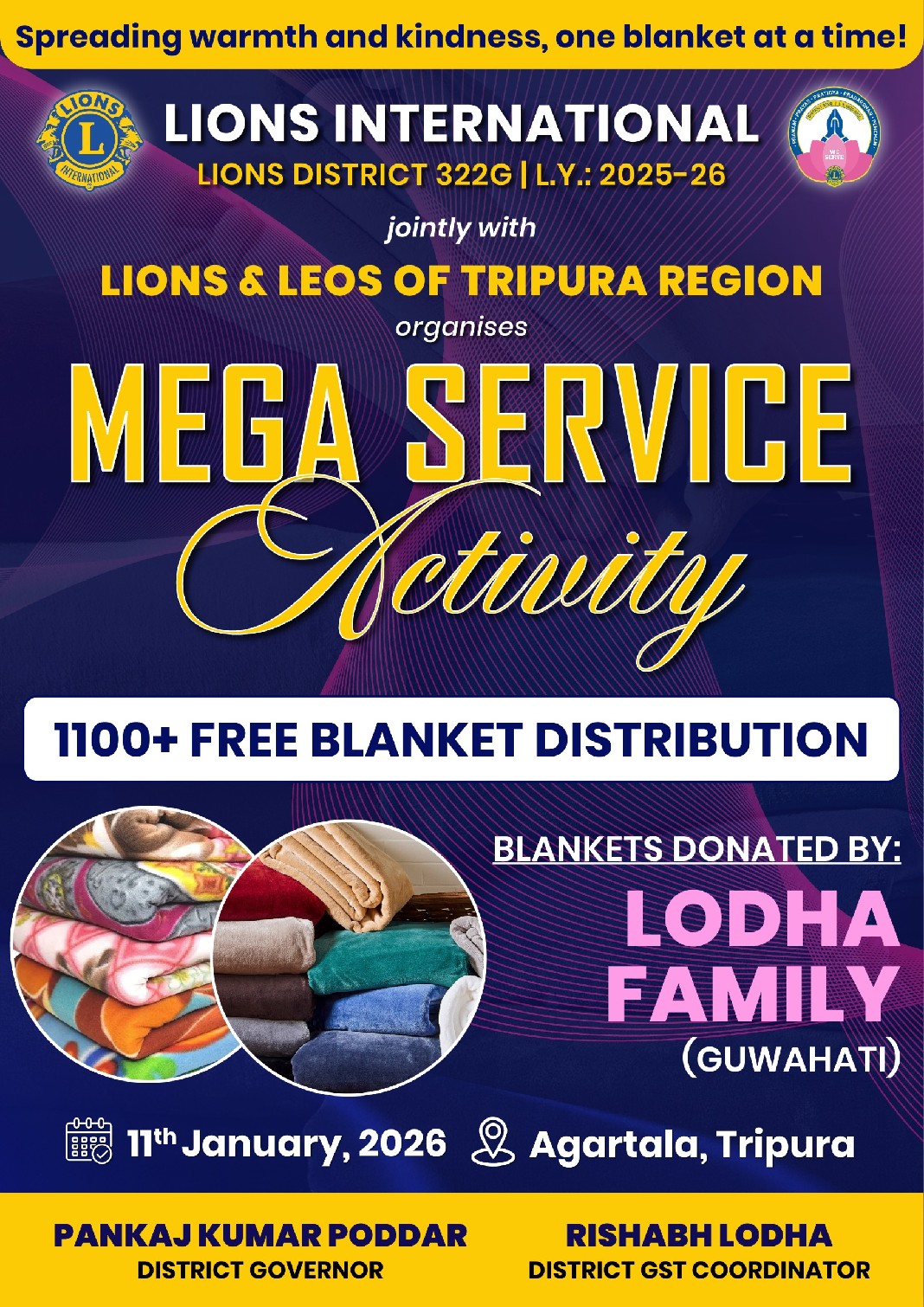 .........Coming Soon........ #LIONS_DISTRICT_322G Jointly with #Lions & Leos of TRIPURA REGION On 11 Jan 2026 @ AGARTALA Organizes #DISTRICT_MEGA_SERVICE_ACTIVITY 1️⃣1️⃣0️⃣0️⃣+ BLANKETS Distribution to the needy and underprivileged. 🗓️ Date: Sunday, 11th January 2026 📍 Venue: AGARTALA 🙌🏼 This Noble Initiative is possible through the Donation & Generosity of: - # LODHA_FAMILY (GUWAHATI) We warmly invite all Clubs with Lions & Leos to join this noble cause with maximum participation and make this MEGA DISTRICT SERVICE EVENT a grand success. In SERVICE & UNITY, - Rishabh Lodha District GST Coordinator LIONS DISTRICT 322G